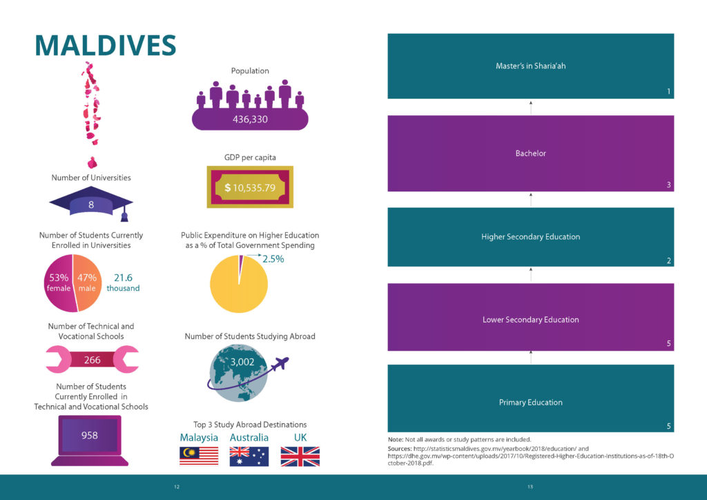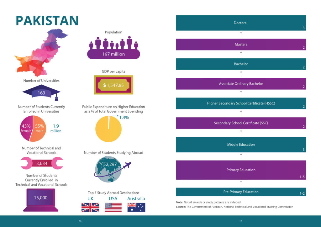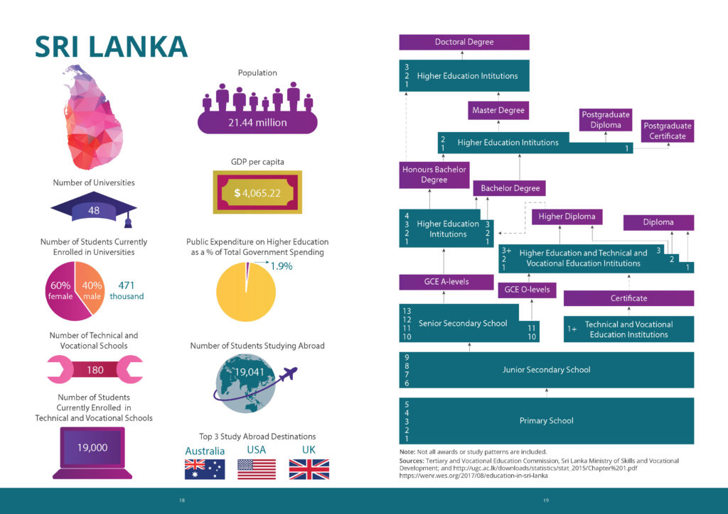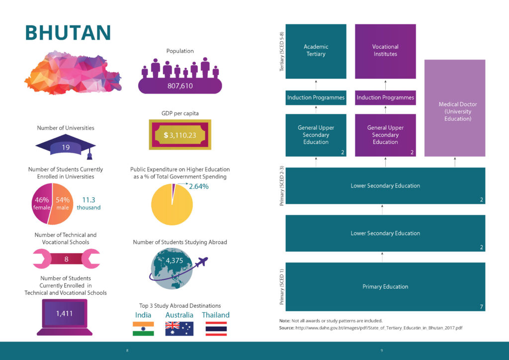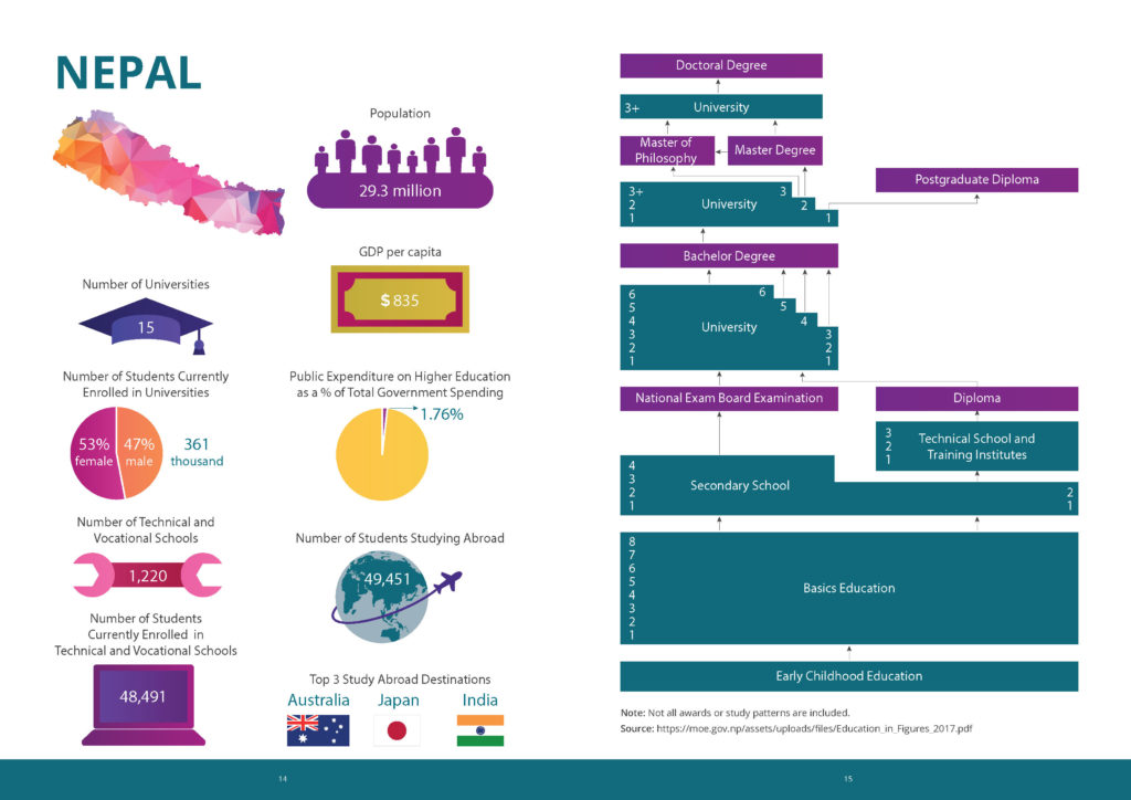 The booklet provides information on the higher educational systems of each country in South Asia. Each country’s educational tracks are mapped, providing insight about how students progress through various system options. In addition to available tracks, the booklet provides statistical information on each country’s system, including but not limited to demographics, number of institutions, and enrollment.